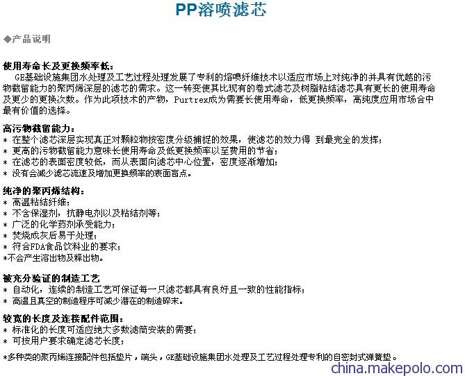GE基礎設施集團水處理及工藝過程處理發展了專利的熔噴纖維技術以適應市場上對純凈的并具有優越的污物截留能力的聚丙烯深層濾芯的需求。這一轉變使其比現有的卷式濾芯及樹脂粘結濾芯具有更長的使用壽命及更少的更換次數。作為此項技術的產物,Purtrex成為需要長使用壽命,低更換頻率,高純度應用市場中最有價值的選擇。