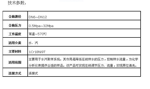 JYF-32C減壓閥主要用于水汽取樣系統。其作用是降低在線樣水的壓力,控制樣水流量,為化學分析儀表提供合適的樣品。